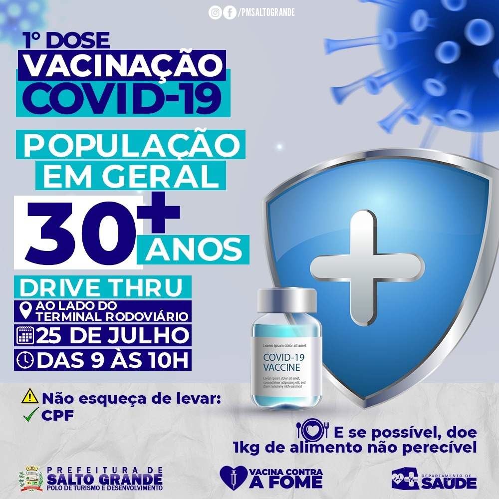 O Departamento de Saúde de Salto Grande (19 km de Ourinhos), imuniza, com a primeira dose contra a Covid-19, neste domingo, 25, pessoas com idade a partir de 30 anos e as que ainda não tomaram a 1º dose do imunizante.