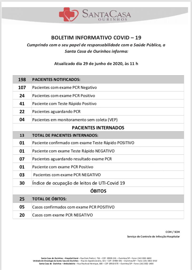 Em mais um Boletim Informativo Covid-19, a Santa Casa de Misericórdia de Ourinhos, confirmou na manhã desta segunda-feira, 29, a quinta morte por coronavírus na cidade. O caso foi confirmado via exame laboratorial.