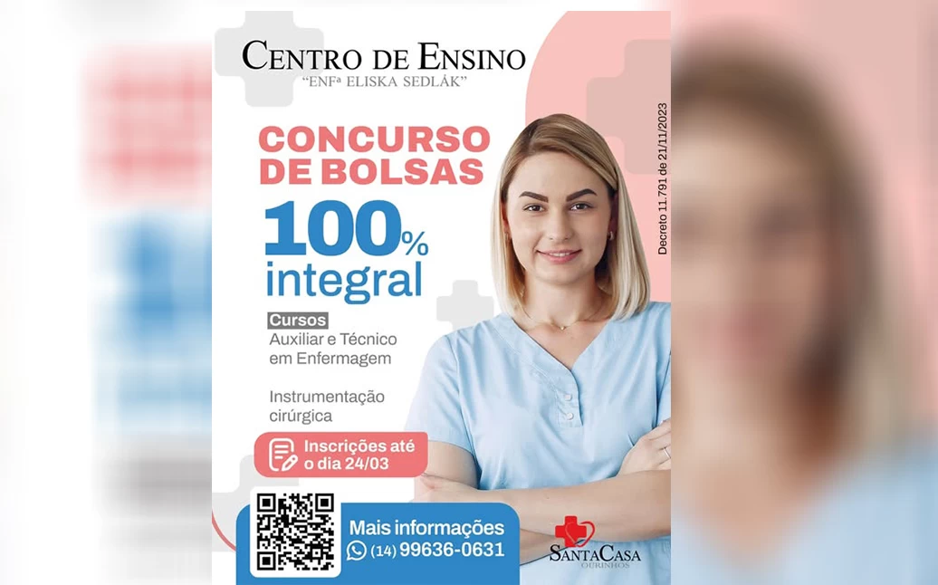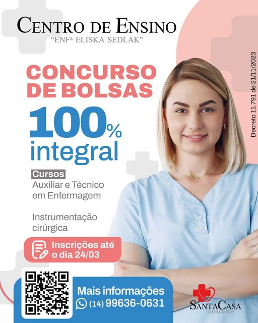 O Centro de Ensino Enfª. Eliska Sedlák, da Santa Casa de Ourinhos, está com inscrições abertas para um concurso de bolsas 100% integrais nos cursos de Auxiliar e Técnico em Enfermagem e Instrumentação Cirúrgica.