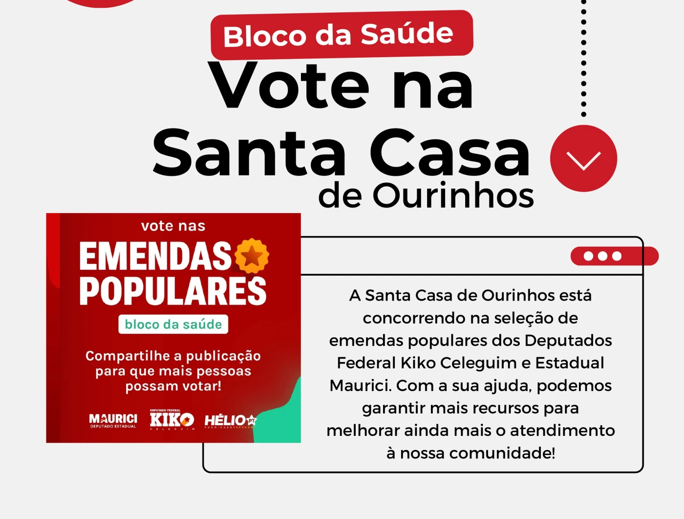 A Santa Casa de Ourinhos está entre as instituições participantes da seleção de emendas populares promovida pelos deputados federal Kiko Celeguim e estadual Maurici. A iniciativa permitirá que 10 entidades escolhidas por votação popular recebam R$ 200 mil cada, totalizando R$ 2 milhões em recursos destinados a melhorias em atendimento e infraestrutura.