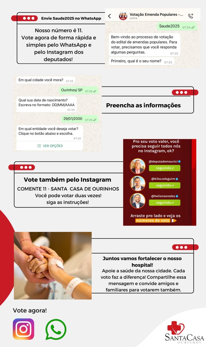 Para garantir esse reforço financeiro, a população de Ourinhos pode votar na entidade número 11, representando a Santa Casa. É possível participar pelo WhatsApp ou Instagram dos deputados: