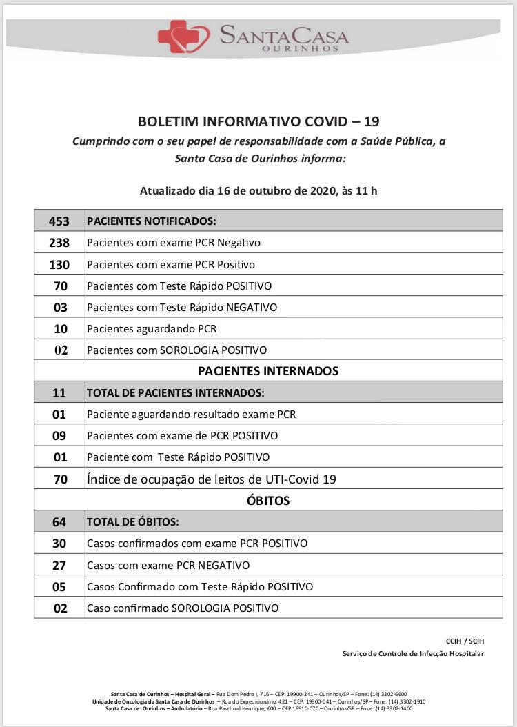 De acordo com a Prefeitura de Ourinhos, o óbito da cidade é de um senhor de 79 anos, com iniciais J. D. Q., morador na Cohab. Ele estava internado na UTI (Unidade de Terapia Intensiva) da Santa Casa de Ourinhos, desde o dia 18/09. A morte foi hoje (dia 16).