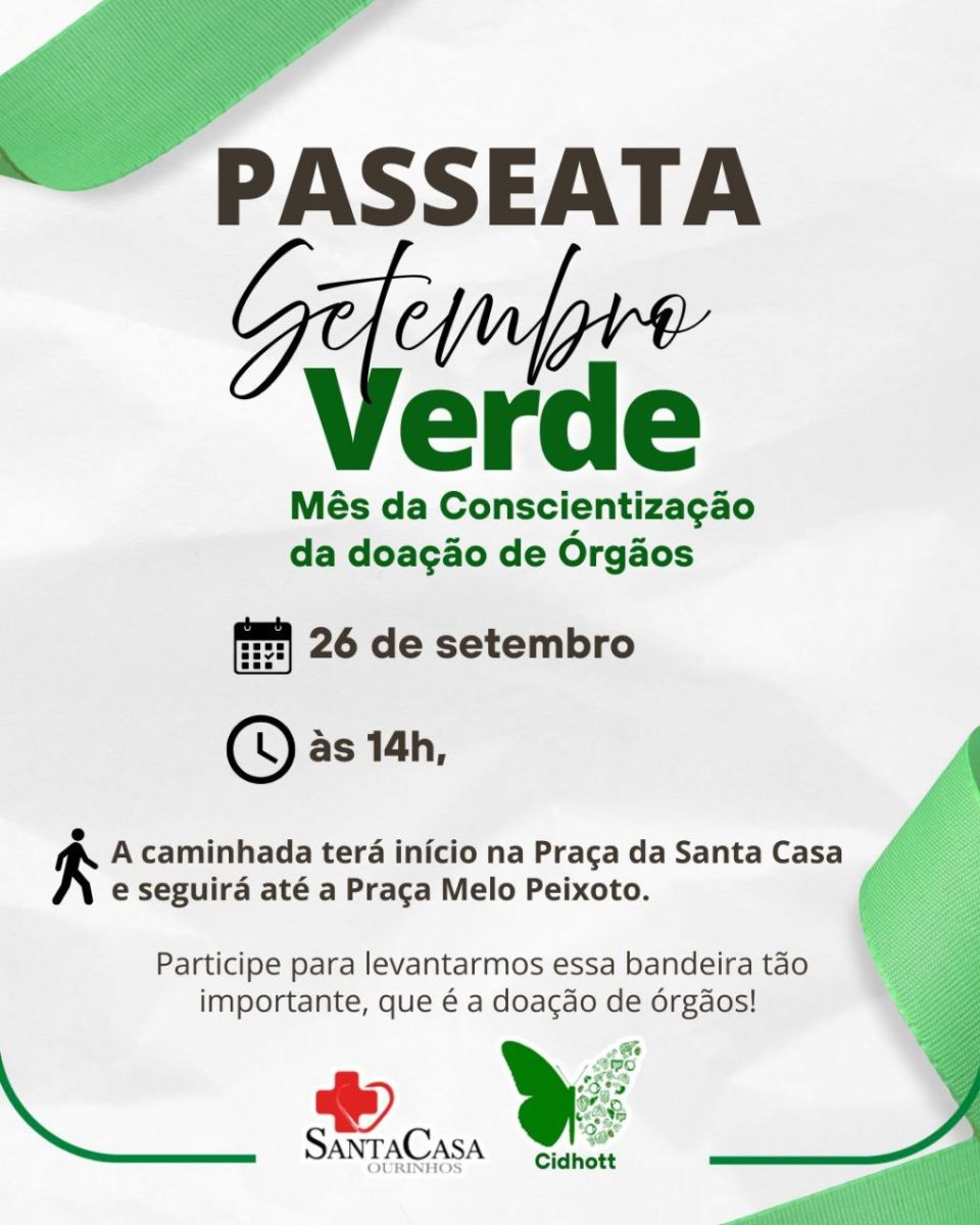 A Santa Casa de Ourinhos, em parceria com o CIHDOTT — Comissão Intra-Hospitalar de Doação de Órgãos e Tecidos para Transplante — convida a população para participar de uma passeata em celebração ao Dia Nacional da Doação de Órgãos, lembrado em 27 de setembro. O evento será realizado na próxima sexta-feira, 26 de setembro, às 14h.