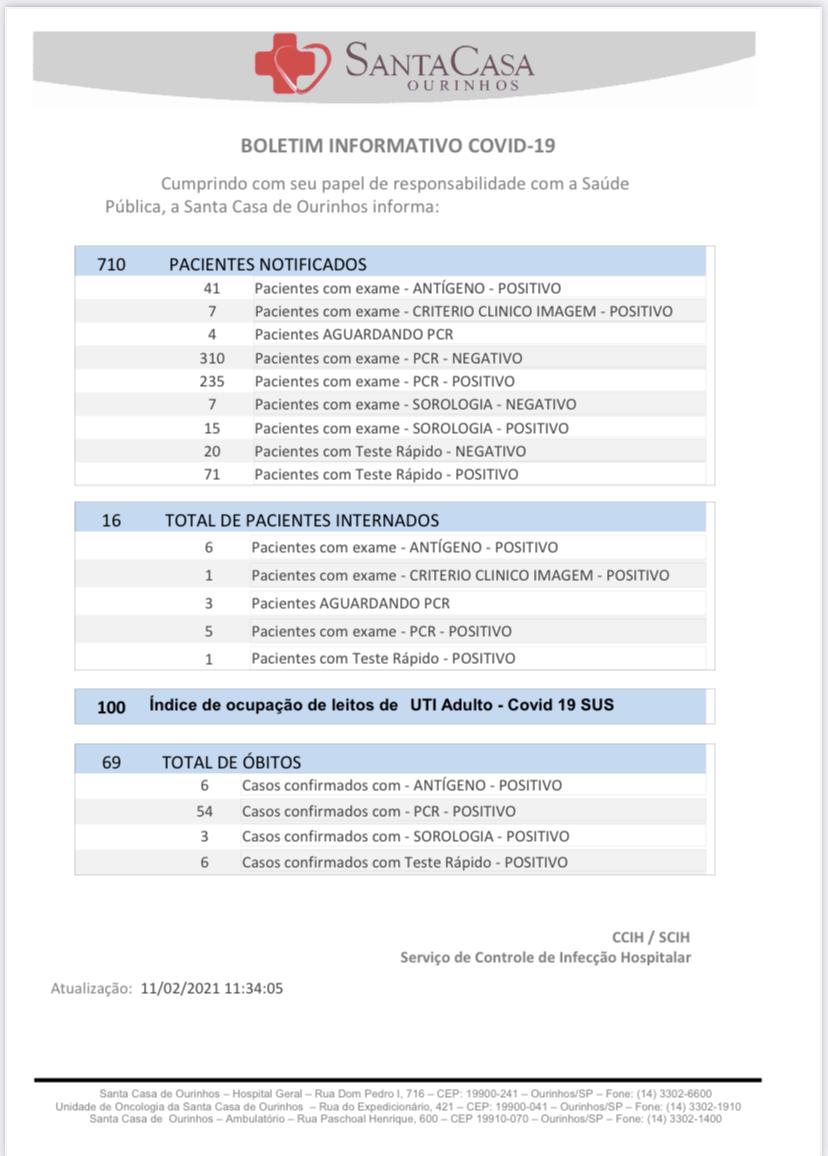 A Santa Casa de Ourinhos informou na tarde desta quinta-feira, 11, o óbito de um paciente do município de Chavantes (19 km de Ourinhos). O Passando a Régua entrou em contato com a Secretaria de Saúde de Chavantes e recebemos a informação que se trata de um homem de 74 anos. Este é 11º óbito por Covid-19 em Chavantes.