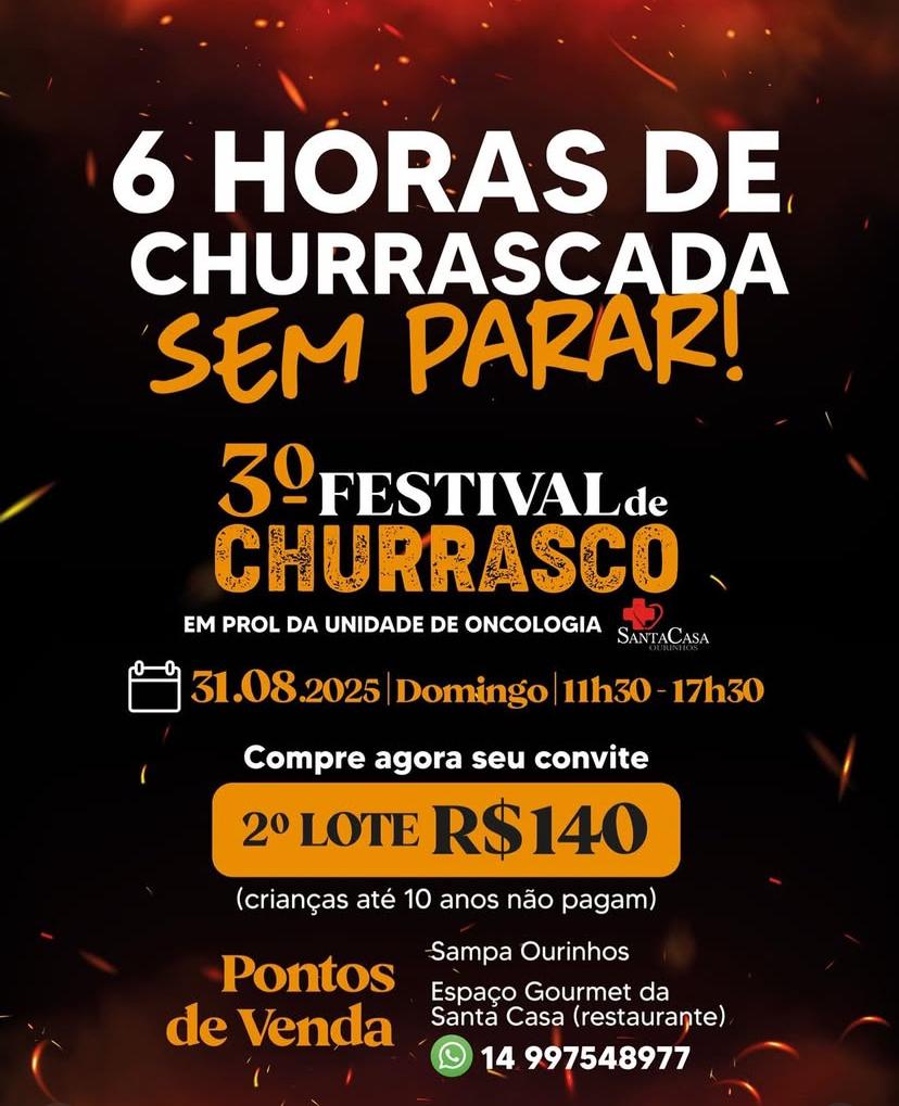 No próximo dia 31 de agosto, a Santa Casa de Ourinhos promove a terceira edição do seu já tradicional Festival de Churrasco. O evento acontecerá das 11h30 às 17h30, na Arena Golden (próximo à APAE Rural), e promete ser a maior e melhor churrascada de Ourinhos e região.