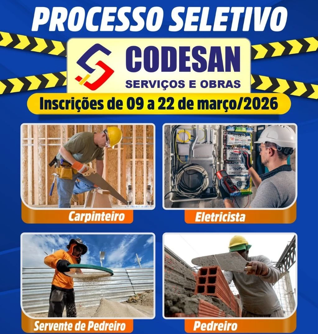 As inscrições estão abertas entre os dias 9 e 22 de março de 2026 e devem ser realizadas exclusivamente pela internet, por meio de formulário disponibilizado pela Prefeitura. O processo seletivo tem como objetivo reforçar a equipe responsável pelas obras e serviços públicos da cidade.