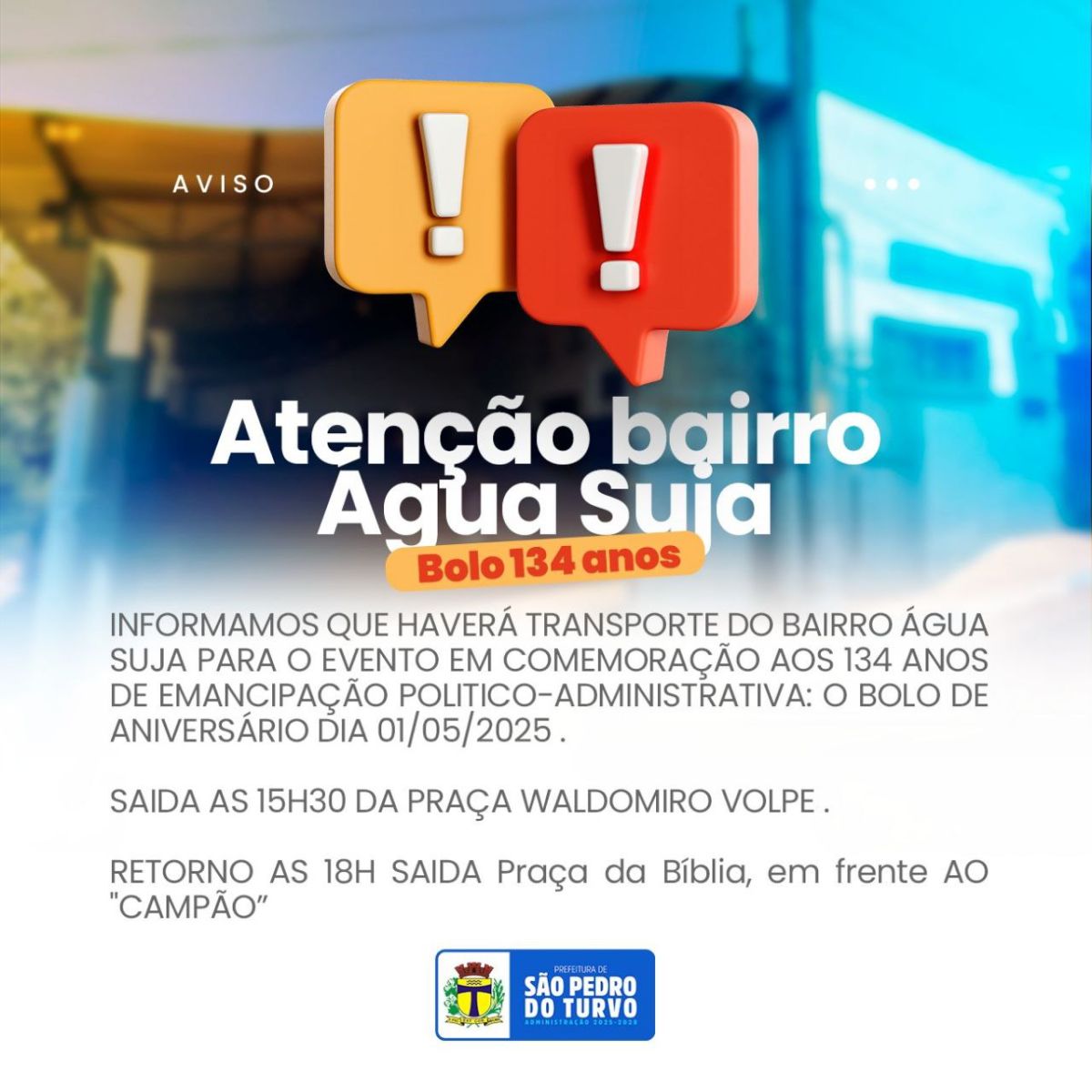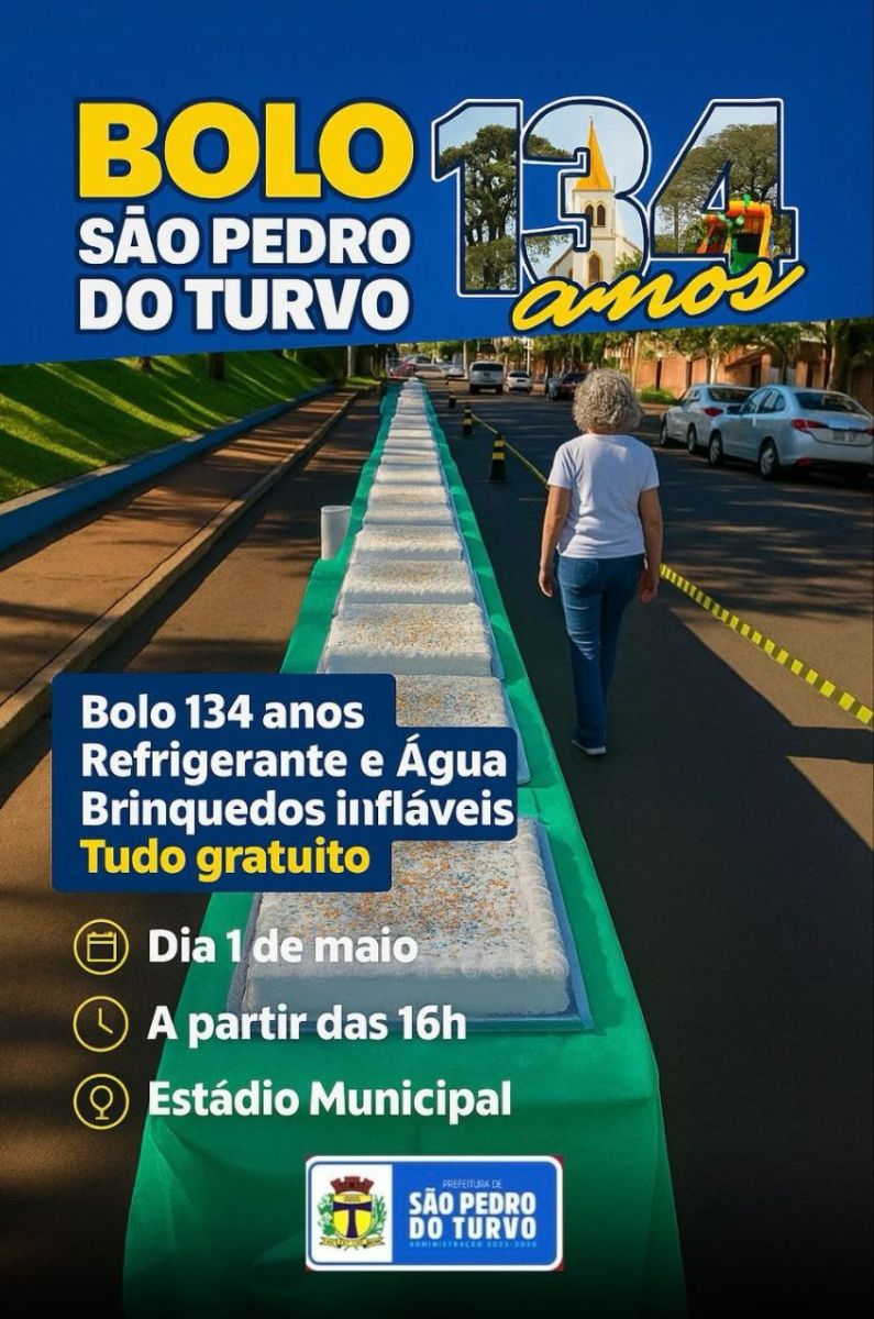 A cidade de São Pedro do Turvo comemora nesta quinta-feira, 1º de maio, seus 134 anos de Emancipação Político-Administrativa com uma grande festa preparada pela Prefeitura. A celebração será realizada a partir das 16h, no Estádio Municipal João Batista Damasceno e Silva, com entrada totalmente gratuita e atrações para toda a família.