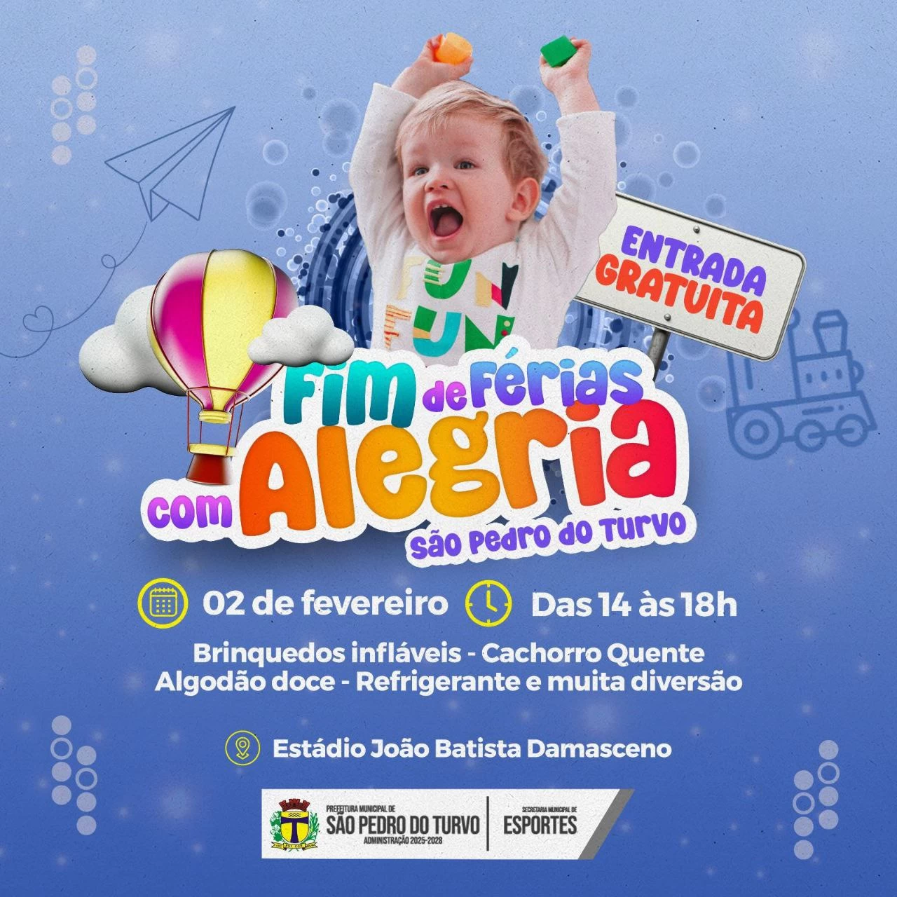 No dia 2 de fevereiro, a Prefeitura Municipal de São Pedro do Turvo, em parceria com a Secretaria Municipal de Esportes, realizará o 1° Fim de Férias com Alegria, um evento especial para celebrar o encerramento das férias escolares com muita diversão para as crianças e famílias da cidade.