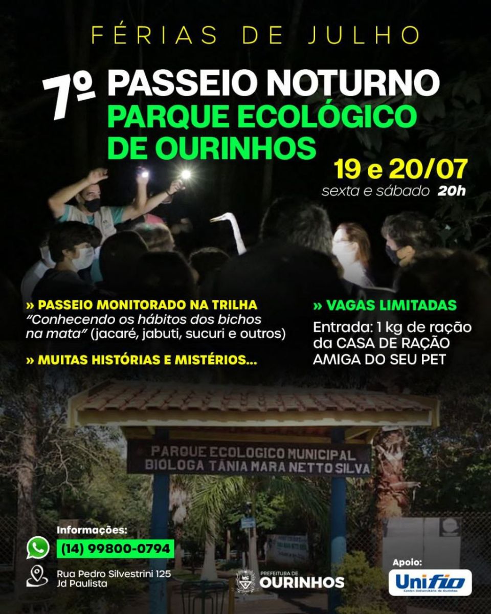Nos dias 19 e 20 de julho, a Secretaria Municipal do Meio Ambiente e Agricultura de Ourinhos realizará o 7º Passeio Noturno no Parque Ecológico “Tânia Mara Netto Silva”. Durante o evento, os visitantes, acompanhados por um guia, poderão se aventurar na mata atlântica e conhecer algumas espécies de árvores nativas e animais de hábitos noturnos, como jacarés, jabutis e sucuris.