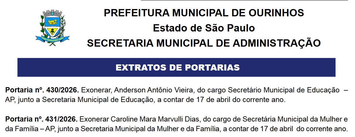 De acordo com as portarias nº 430 e nº 431/2026, foram desligados de seus cargos Anderson Antônio Vieira, que ocupava a Secretaria Municipal de Educação, e Caroline Mara Marvulli Dias, responsável pela Secretaria Municipal da Mulher e da Família. As exonerações passam a valer a partir desta mesma data.