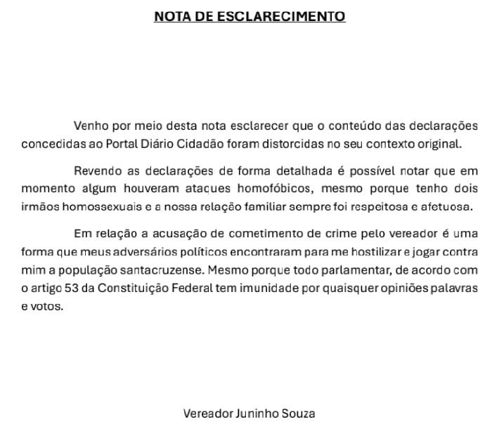 A denúncia foi formalizada pelo vereador Professor Duzão, que também é presidente do PSOL no município. Em nota pública, o partido condenou as declarações de Juninho Souza, afirmando que elas “deslegitimam a orientação sexual de indivíduos” e “perpetuam estigmas sociais que contribuem para a discriminação.” A nota de repúdio, compartilhada nas redes sociais do PSOL, traz ainda a reprodução de trechos da fala de Juninho, apontando que ele se posicionou dizendo que “nenhum pai ou mãe é feliz com um filho homossexual” e que “homem com homem e mulher com mulher é errado”.
