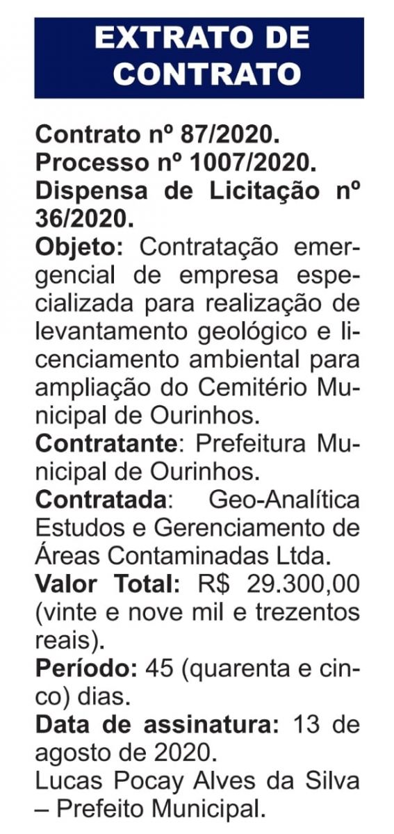 A Prefeitura de Ourinhos publicou no Diário Oficial do Município, nesta sexta-feira, 28, a “Contratação emergencial de empresa especializada para realização de levantamento geológico e licenciamento ambiental para ampliação do Cemitério Municipal de Ourinhos”. O valor do contrato, que não teve licitação, é de R$ 29.300,00 (vinte e nove mil e trezentos reais), para o período: 45 (quarenta e cinco) dias.