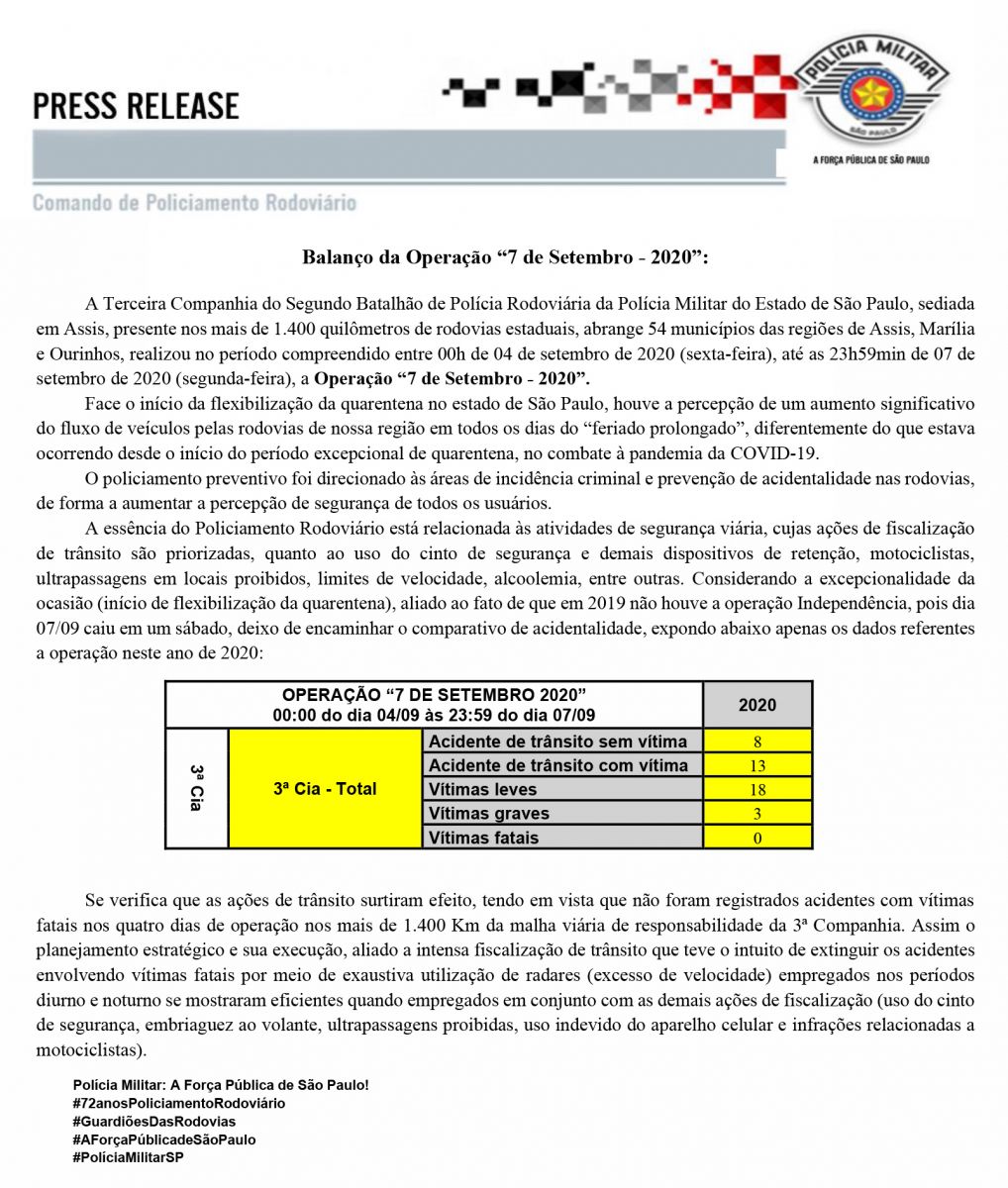 O feriado prologado de 7 de Setembro foi marcado pelo grande fluxo de veículos nas rodovias estaduais da região de Ourinhos, Marília e Assis. Foram 21 acidentes, sendo três graves, com 21 feridos, três com gravidade, mas nenhum óbito registrado. Confira o balanço completo divulgado pela Terceira Companhia do Segundo Batalhão de Polícia Rodoviária da Polícia Militar do Estado de São Paulo. Escute o áudio acima do capitão Daniel Demétrio: