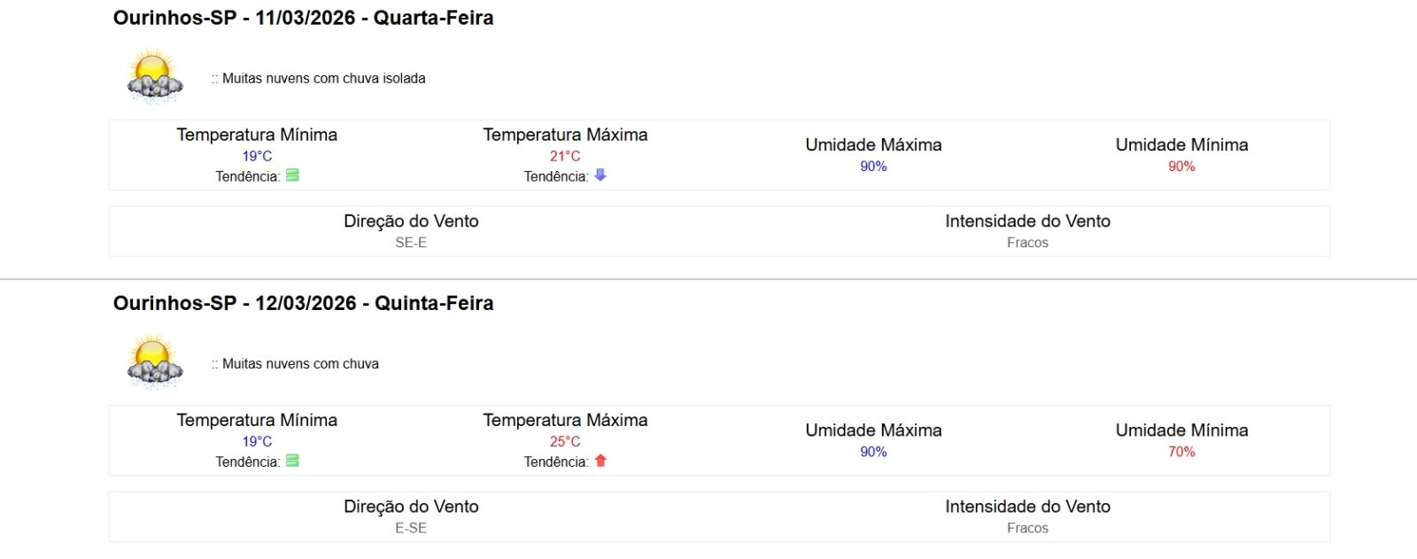 O tempo continua nublado, com chuva ao longo do dia. Os termômetros variam entre 19°C e 25°C, com umidade entre 70% e 90%.
