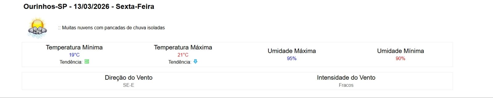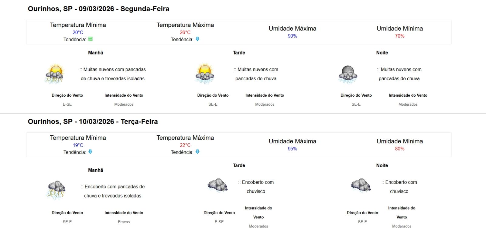 O dia deve ser encoberto, com pancadas de chuva e trovoadas isoladas pela manhã e chuvisco à tarde e à noite. As temperaturas ficam mais amenas, variando entre 19°C e 22°C, com umidade entre 80% e 95%.