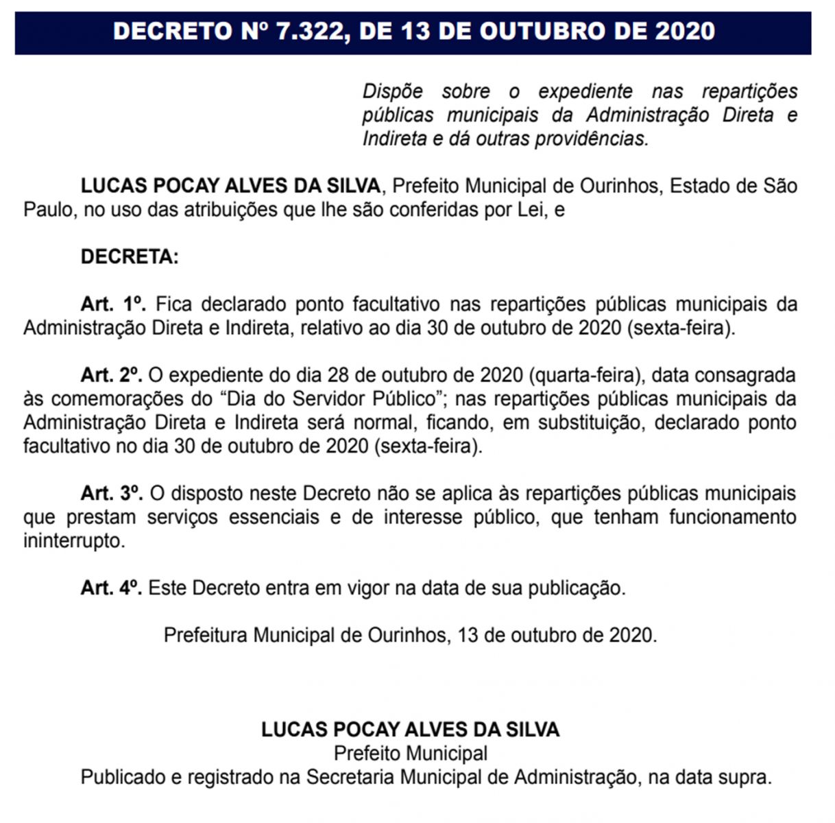 Os servidores públicos municipais de Ourinhos terão na virada do mês de outubro para o mês de novembro um feriadão prolongado, devido a alteração do ponto facultativo em referência ao “Dia do Servidor Público”, comemorado originalmente no dia 28 de outubro, mas que foi alterado este ano para o dia 30, o que fará que o expediente encerre na quinta-feira, 29, às 13h e retorno na terça-feira, dia 3 de novembro, já que na segunda-feira, 2, é feriado nacional “Dia de Finados”. O decreto com a alteração foi publicado na última terça-feira, 13, confira: