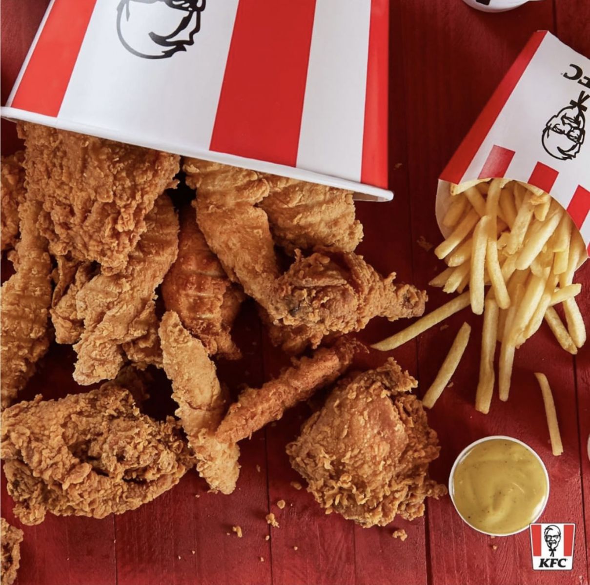 Reverenciado em todo o mundo por seu sabor irresistível e sua crocância inconfundível, o frango frito do KFC é preparado diariamente em cada loja, garantindo frescor e qualidade. O icônico balde de frango é o carro-chefe do cardápio e está disponível nas versões Receita Crocante ou Secreta, esta última composta por uma combinação de 11 ingredientes secretos, a mesma criada pelo seu fundador. Até hoje a receita está guardada em um cofre em Louisville, Kentucky.