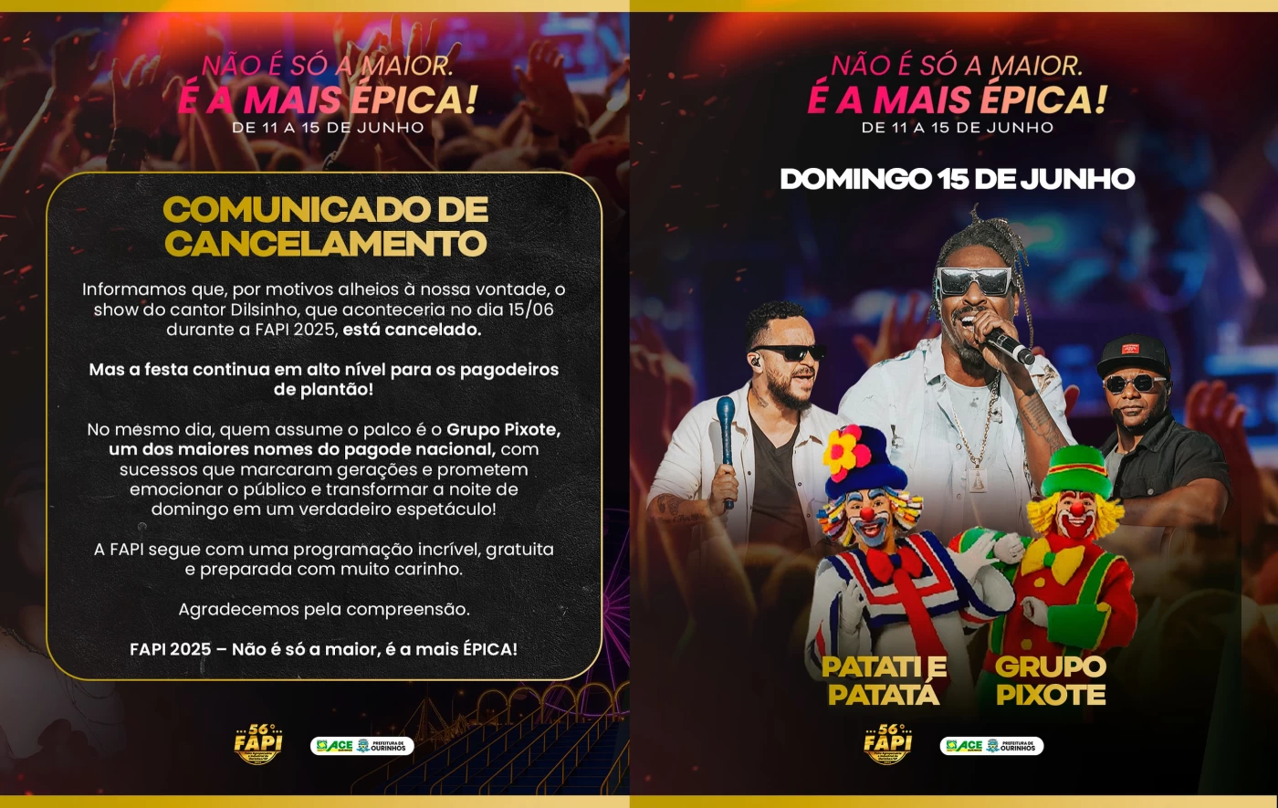 A comissão organizadora da 56ª FAPI (Feira Agropecuária e Industrial de Ourinhos) anunciou no fim da tarde desta terça-feira (3) o cancelamento do show do cantor Dilsinho, que seria a atração de encerramento da festa, no dia 15 de junho. Em seu lugar, quem sobe ao palco será o Grupo Pixote, um dos principais nomes do pagode nacional.