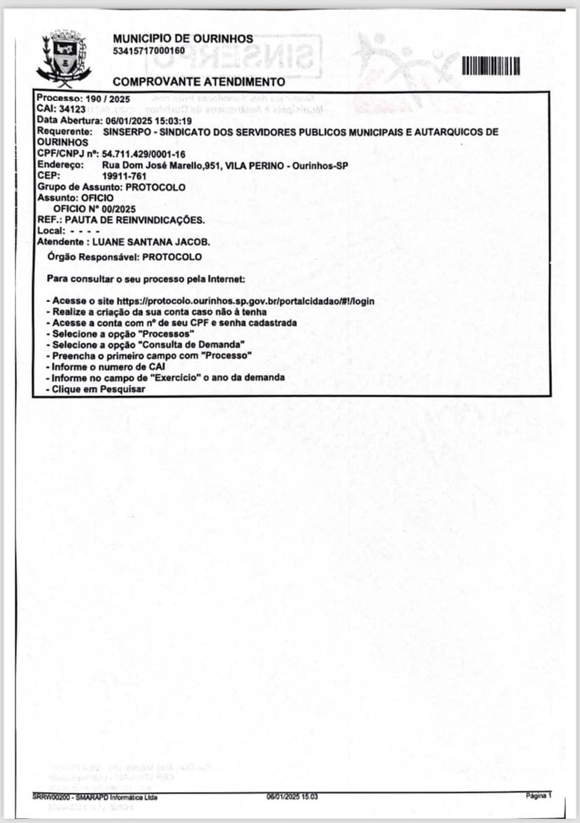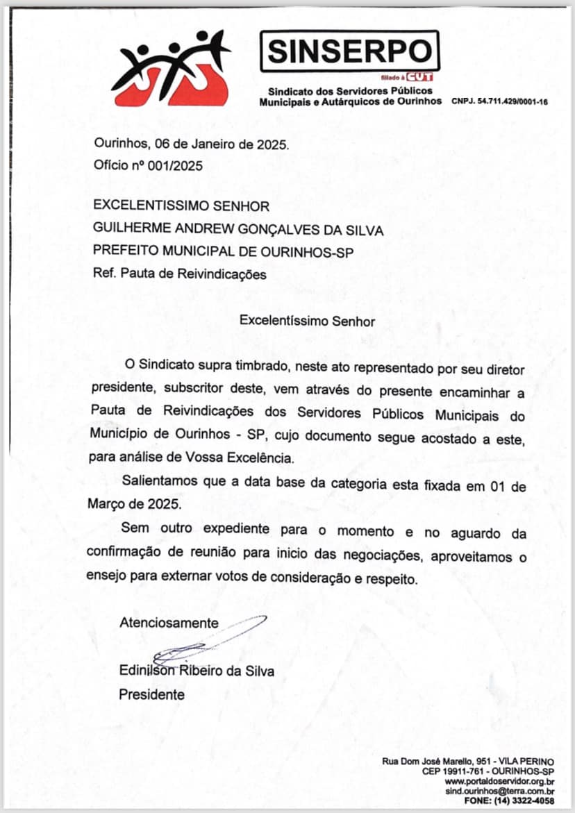 O Sindicato dos Servidores Públicos e Autárquicos de Ourinhos (SINSERPO) deu início nesta segunda-feira, 6 de janeiro, à sua Campanha Salarial 2025. O presidente da entidade, Edinilson Ribeiro da Silva, conhecido como Biguá, protocolou um ofício na Prefeitura solicitando uma reunião e apresentando a pauta de reivindicações aprovada pela categoria.