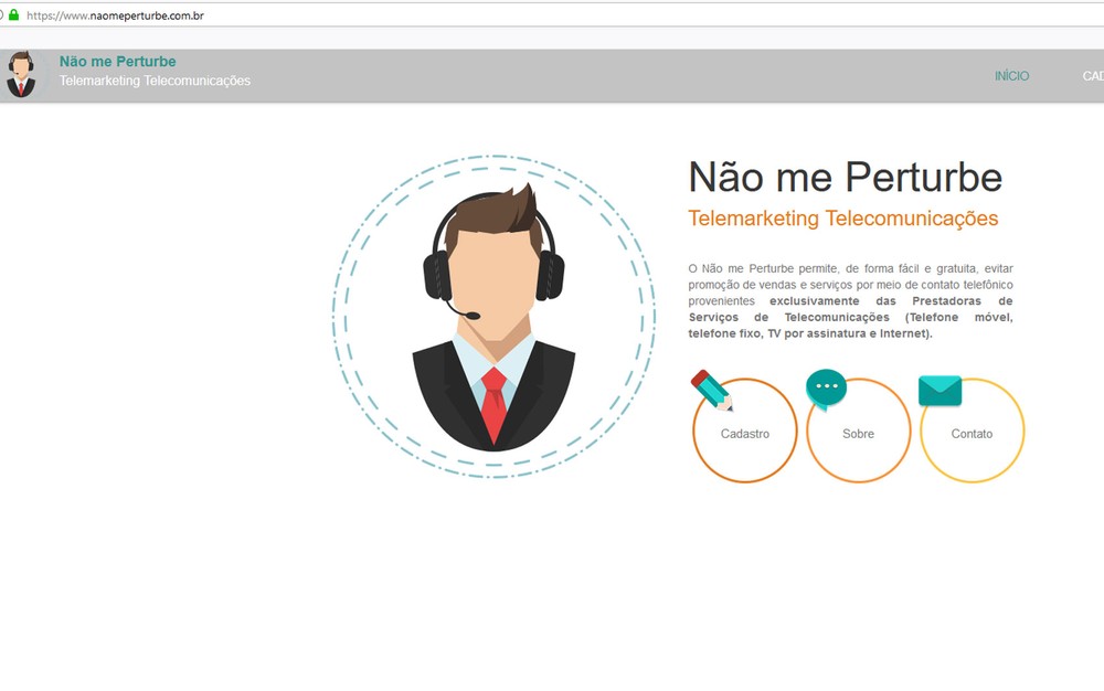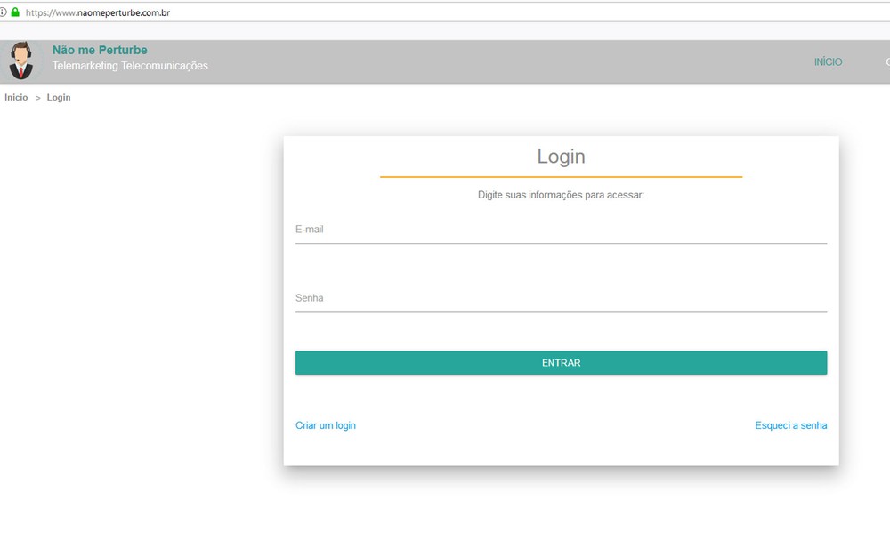 Tela de cadastro no site 'Não Perturbe' — Foto: Reprodução