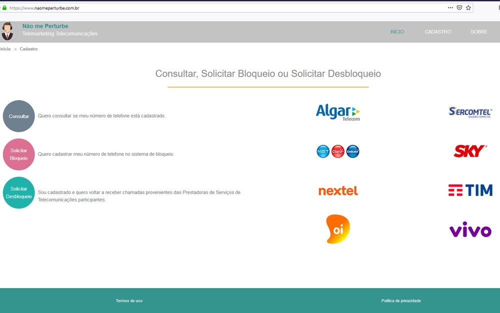 Para bloquear a ligação das empresas de telecomunicação é fácil: acesse o site www.naomeperturbe.com.br e se cadastre, criando um login (com seu e-mail) e uma senha. O menu seguinte vai pedir também seu CPF. Depois, basta cadastrar o número do telefone (celular ou fixo). É possível cadastrar mais de uma linha.