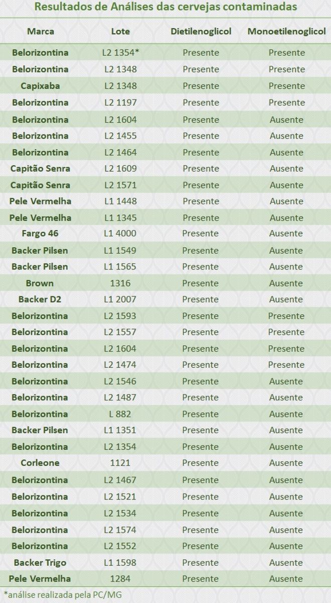 A maioria dos lotes são das cerveja Belorizontina, mas as análises mostram contaminação em outros nove rótulos. As duas novas marcas que foram identificadas contaminações são a Corleone e a Backer Trigo. As análises são realizadas pelos Laboratórios Federais de Defesa Agropecuária.