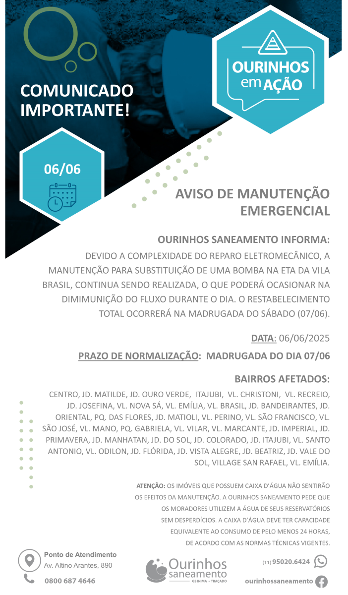 A empresa Ourinhos Saneamento, responsável pelos serviços de água e esgoto do município, emitiu um comunicado na manhã desta sexta-feira, 6, informando sobre a continuidade da manutenção para substituição de uma bomba na Estação de Tratamento de Água (ETA) da Vila Brasil.