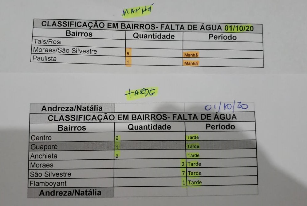 Inácio enviou a nossa reportagem o controle de reclamações por falta d’água desta quinta-feira (1), que apontou seis reclamações pela manhã e 15 à tarde, principalmente de moradores do Jardim São Silvestre, que tem histórico de problemas com abastecimento, por ficar em uma região alta da cidade.