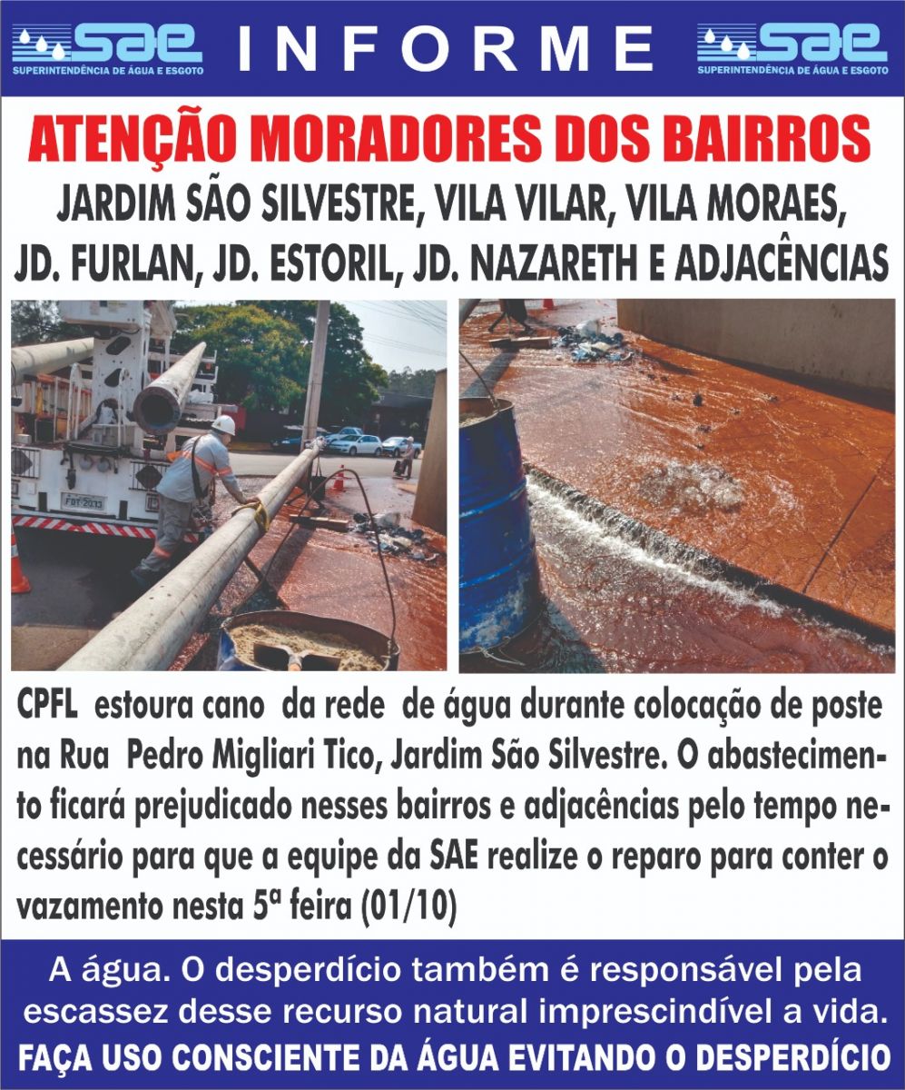 A SAE inclusive emitiu um comunicado sobre um reparo realizado durante a tarde, o que compromete o abastecimento na região. Confira: