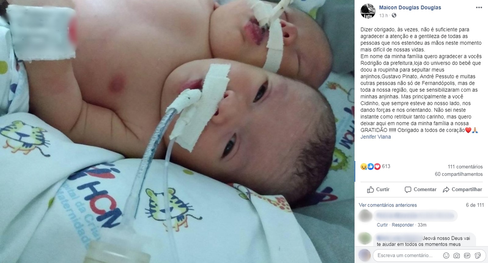 Pai das gêmeas fez uma postagem no Facebook agradecendo o apoio que recebeu das pessoas — Foto: Reprodução/Facebook