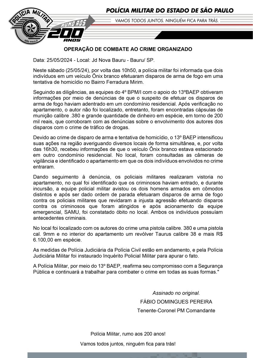 Neste sábado, 25 de maio de 2024, por volta das 10h50, a Polícia Militar de Bauru foi acionada após dois indivíduos em um veículo Ônix branco efetuarem disparos de arma de fogo em uma tentativa de homicídio no Bairro Ferradura Mirim. As equipes do 4º BPM/I, com apoio do 13º BAEP, iniciaram diligências e receberam informações de que os suspeitos haviam se refugiado em um condomínio residencial.