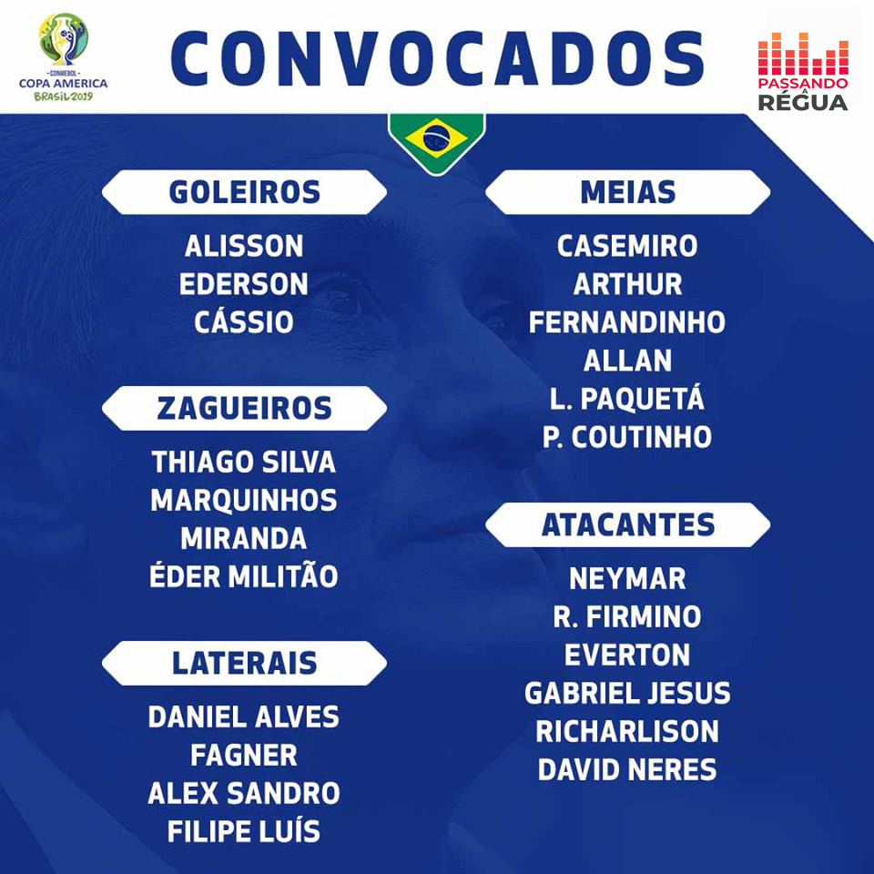 Tite anunciou hoje a sua lista de 23 jogadores para a disputa da Copa América. David Neres, do Ajax, foi confirmado para a competição, assim como Fernandinho, do Manchester City. Vinicius Júnior, do Real Madrid, ficou fora como já era o esperado. Fabinho, do Liverpool, vivia a esperança de ser chamado, mas não entrou no chamado. "Foi a lista mais difícil que eu tive até hoje para fechar. Não dormi. Nem a minha esposa conseguiu me ajudar. São oportunidades para atletas jovens, emergentes, com alguns atletas que já participaram e tem um know how. Esses oito amistosos até aqui nos levaram até a lista", afirmou.