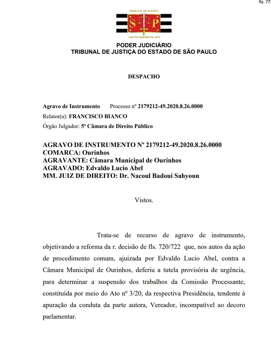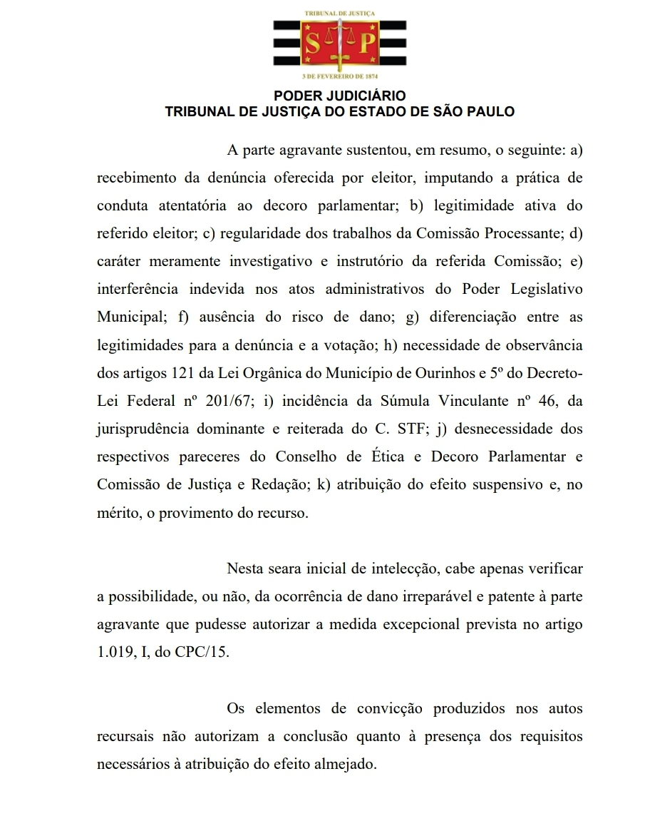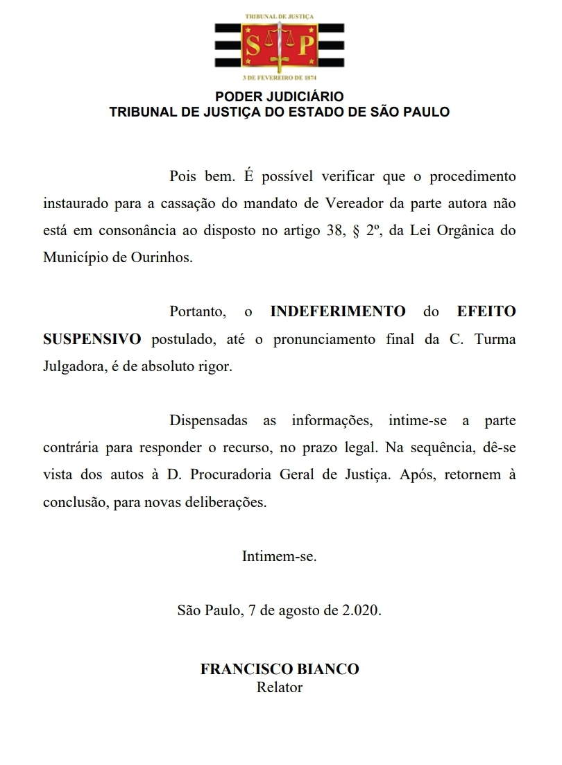O TJ (Tribunal de Justiça do Estado de São Paulo) indeferiu o pedido de recurso de “Agravo de Instrumento” da Câmara Municipal de Ourinhos, contra a decisão do dia 8 de julho, proferida pelo juiz Dr. Nacoul Badoui Sahyoun, que determinou a suspensão dos trabalhos da CP (Comissão Processante) instalada contra o vereador Edvaldo Lúcio Abel “Vadinho” (PSDB).