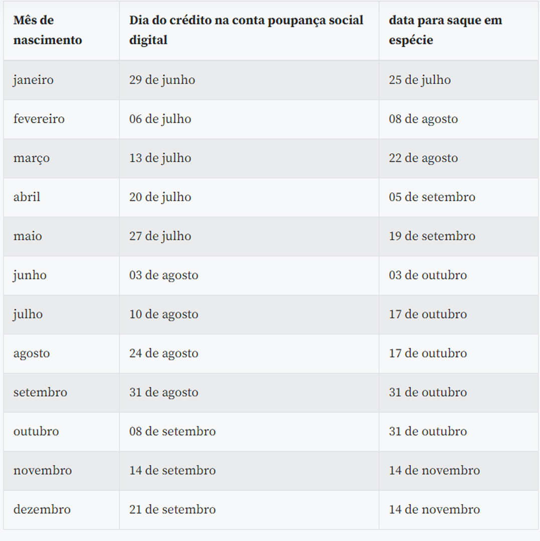 O dinheiro só será liberado para saque ou transferência para outra conta bancária a partir de 14 de novembro para os trabalhadores nascidos em dezembro. O calendário de crédito na conta poupança digital e de saques foi estabelecido com base no mês de nascimento do trabalhador.