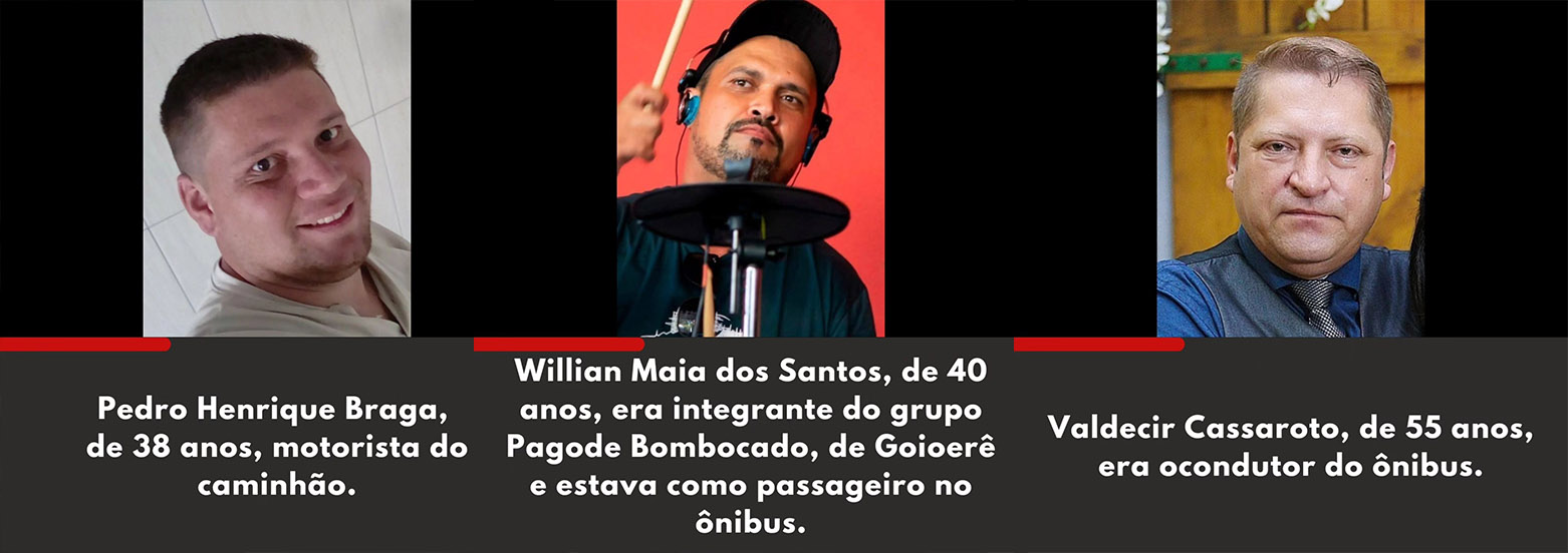 As vítimas fatais foram identificadas como Pedro Henrique Braga, de 38 anos, motorista do caminhão; Valdecir Cassaroto, de 55 anos, motorista do ônibus; e Willian Maia dos Santos, de 40 anos, passageiro do coletivo e integrante do grupo musical Pagode Bombocado, de Goioerê. Os três morreram presos às ferragens, ainda no local do acidente.