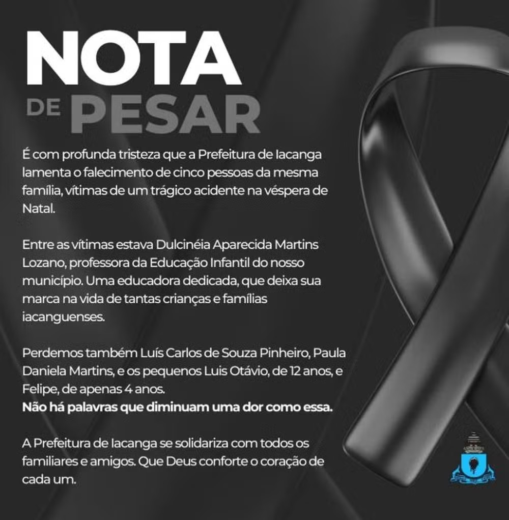 A morte de cinco pessoas da mesma família em um grave acidente de trânsito, na noite de quarta-feira (24), véspera de Natal, provocou forte comoção na cidade de Iacanga, no interior paulista. As vítimas eram moradores do município, que tem pouco mais de 10 mil habitantes, e eram bastante conhecidas pela comunidade.