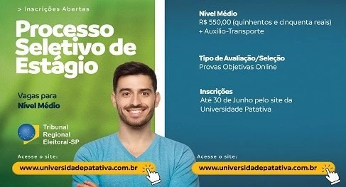 O Tribunal Regional Eleitoral de São Paulo (TRE-SP) abriu inscrições, nesta segunda (17), para preencher 124 vagas de estágio para estudantes de nível médio. Interessados podem se inscrever até 30 de junho no site da Universidade Patativa do Assaré, responsável pelo programa de estágios da Justiça Eleitoral paulista. Além das vagas existentes, está prevista a formação de cadastro reserva.