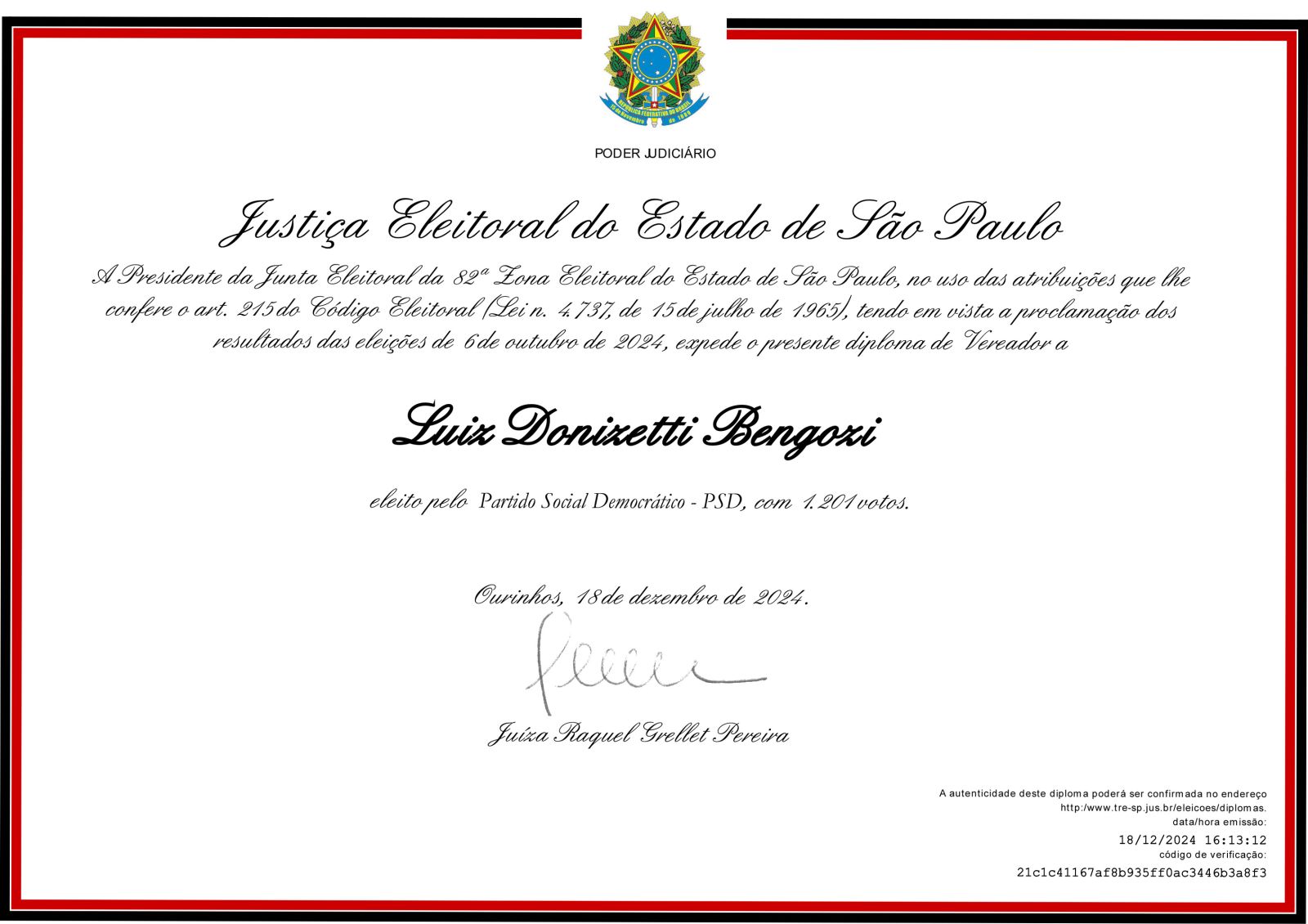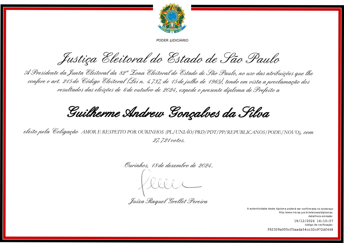 O sistema do TRE-SP também permite que qualquer pessoa consulte e emita o diploma de políticos eleitos. Nós do Passando a Régua entramos no site e conseguimos emitir os documentos do prefeito eleito Guilherme Gonçalves (Podemos), que assumirá o Executivo municipal, e do vereador Borjão (PSD), reeleito para mais um mandato.