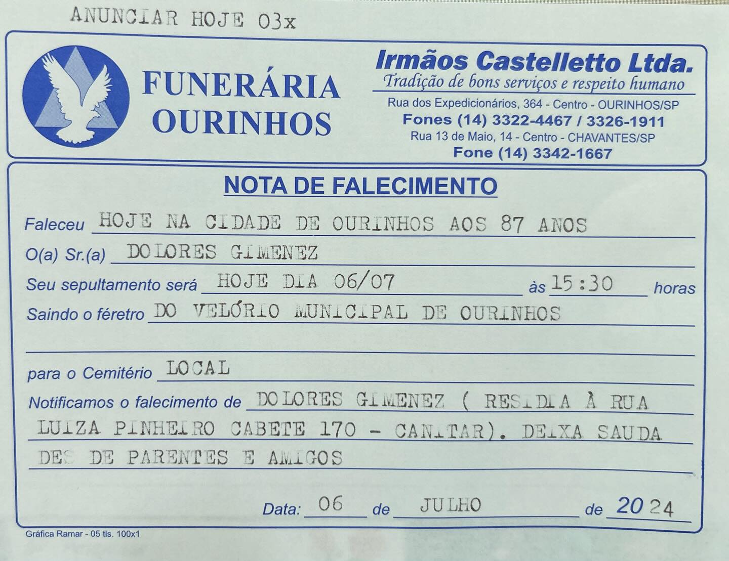 Faleceu Dolores Gimenez, aos 87 anos. O velório está sendo realizado no Velório Municipal de Ourinhos, com sepultamento marcado para hoje, dia 6, às 15h30, no Cemitério Municipal de Ourinhos.
