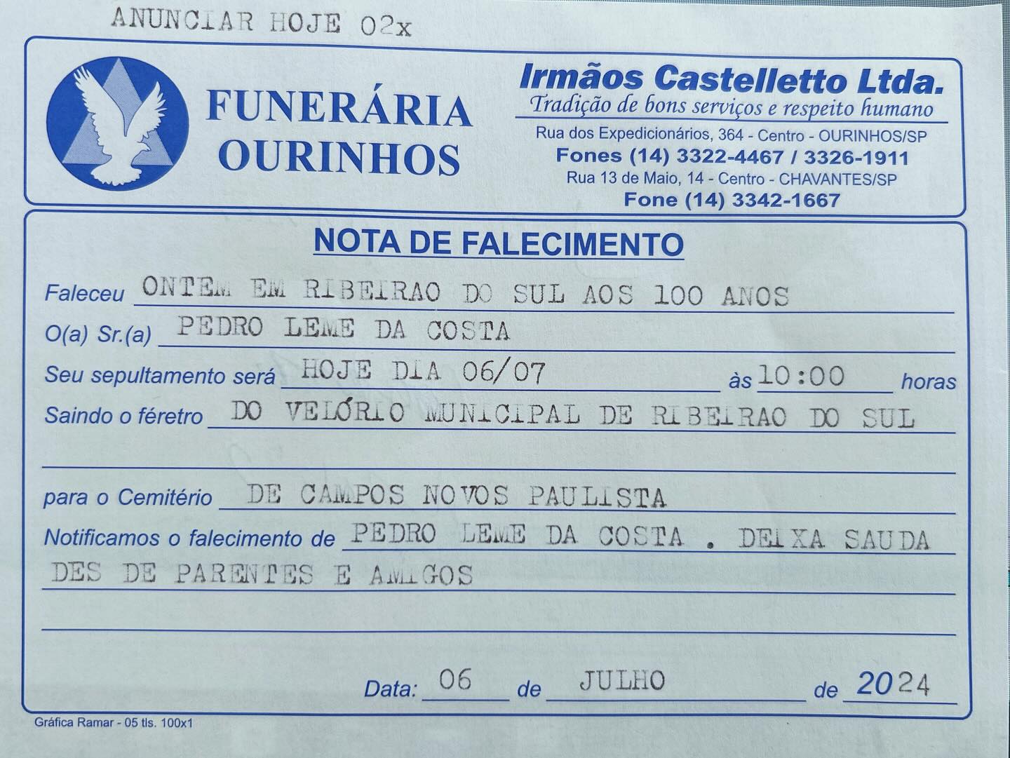 Faleceu Pedro Leme da Costa, aos 100 anos. Está sendo velado no Velório Municipal de Ribeirão do Sul, e o sepultamento ocorrerá hoje, dia 6, às 10 horas, no Cemitério Municipal de Campos Novos Paulista, em São Paulo.
