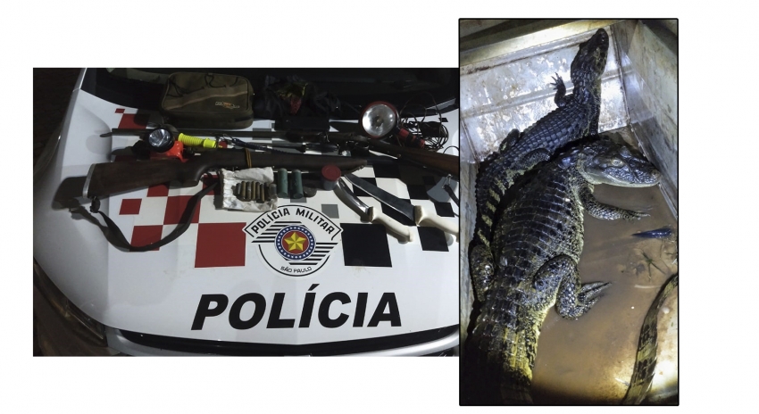 Segundo os policiais militares duas armas sem numeração, além de fisga, lanternas e vasta quantidade de cartuchos foram localizados em veículo pertencente ao trio, que tinha caçado dois jacarés, que estavam ainda vivos e foram liberados pelos policiais.