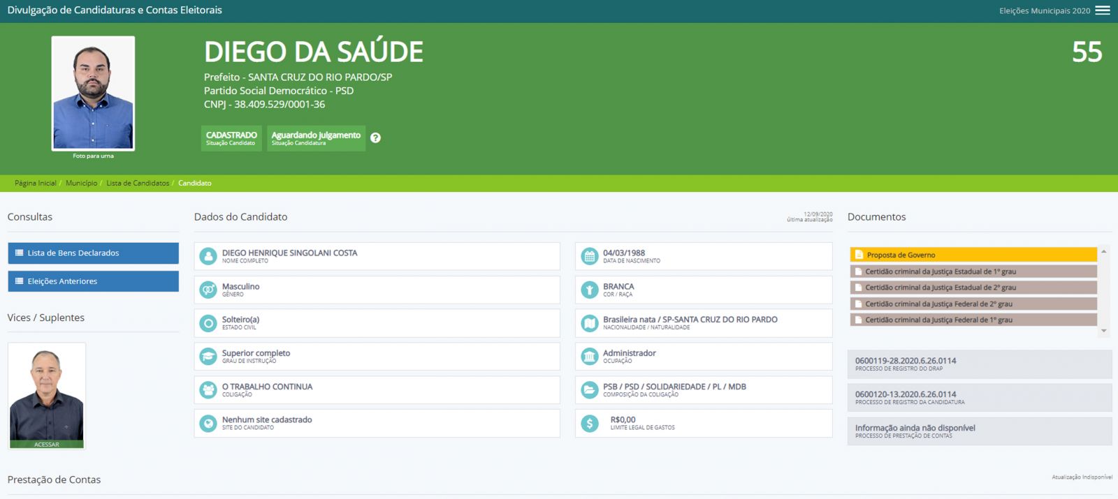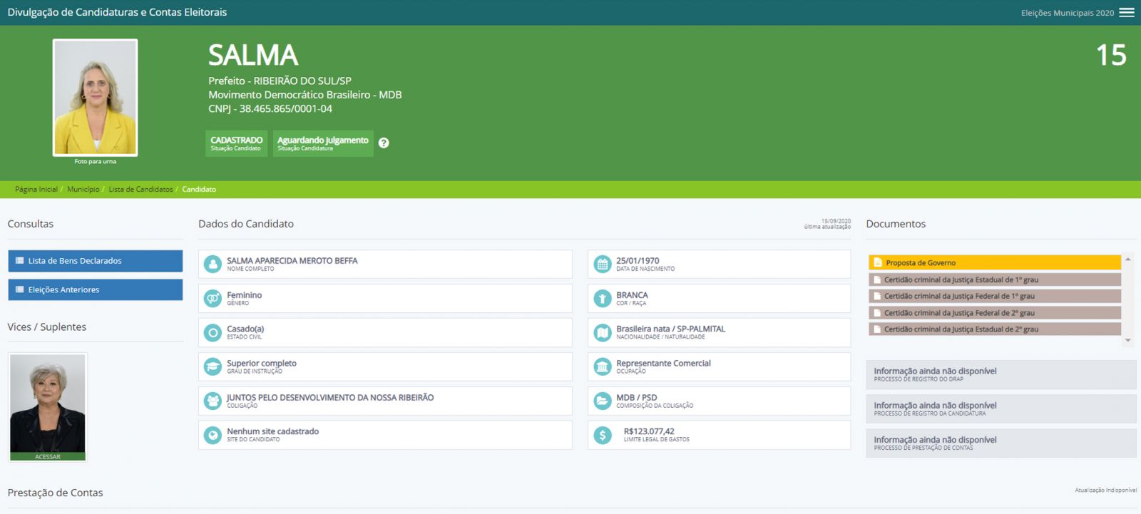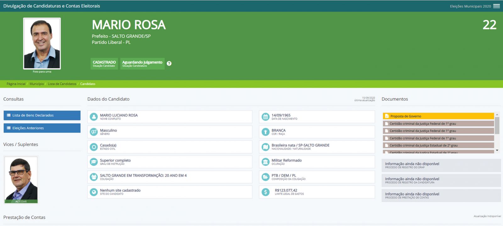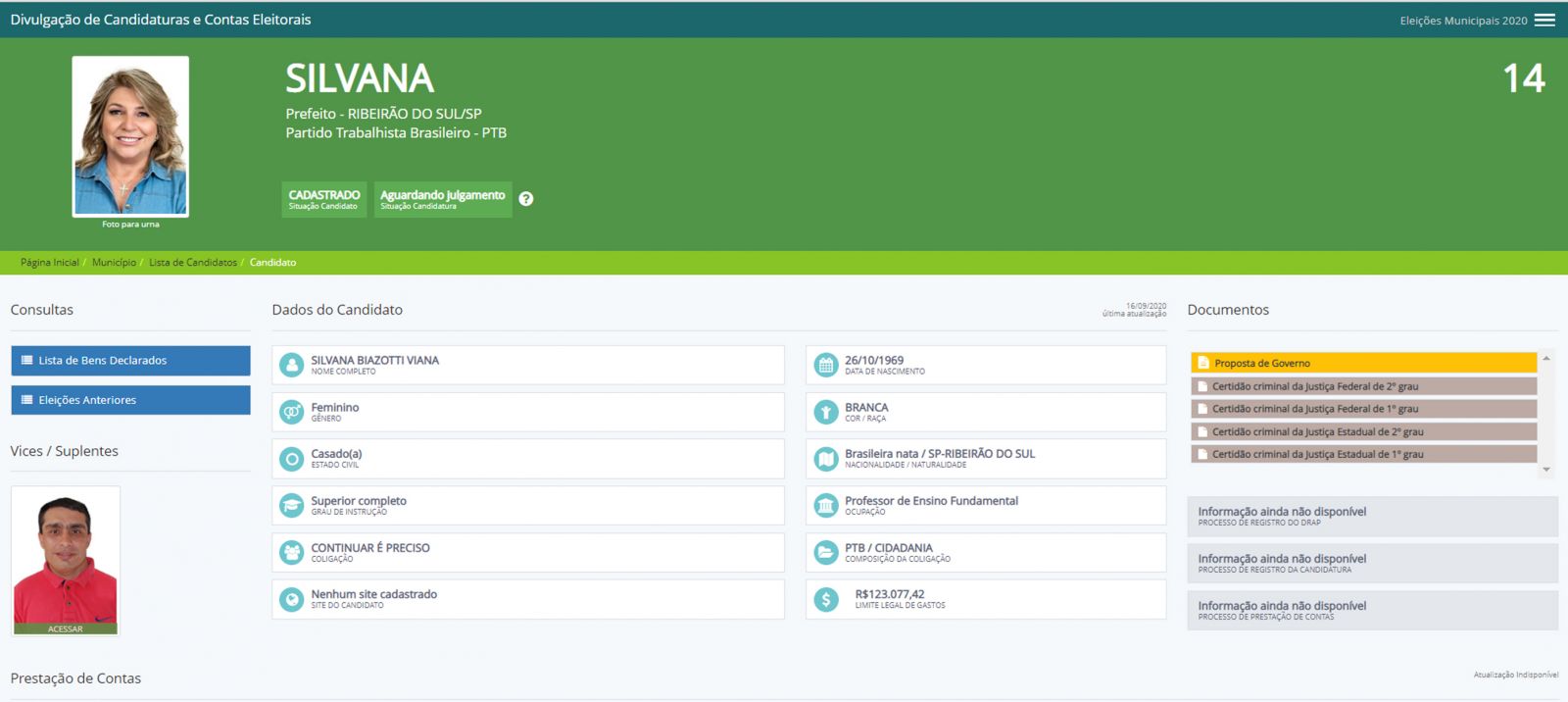 A situação do registro do candidato aparece ao lado da foto, além do tipo de eleição à qual ele está concorrendo e um guia sobre os termos, inclusive os jurídicos, utilizados para definir a situação dele perante a Justiça Eleitoral.