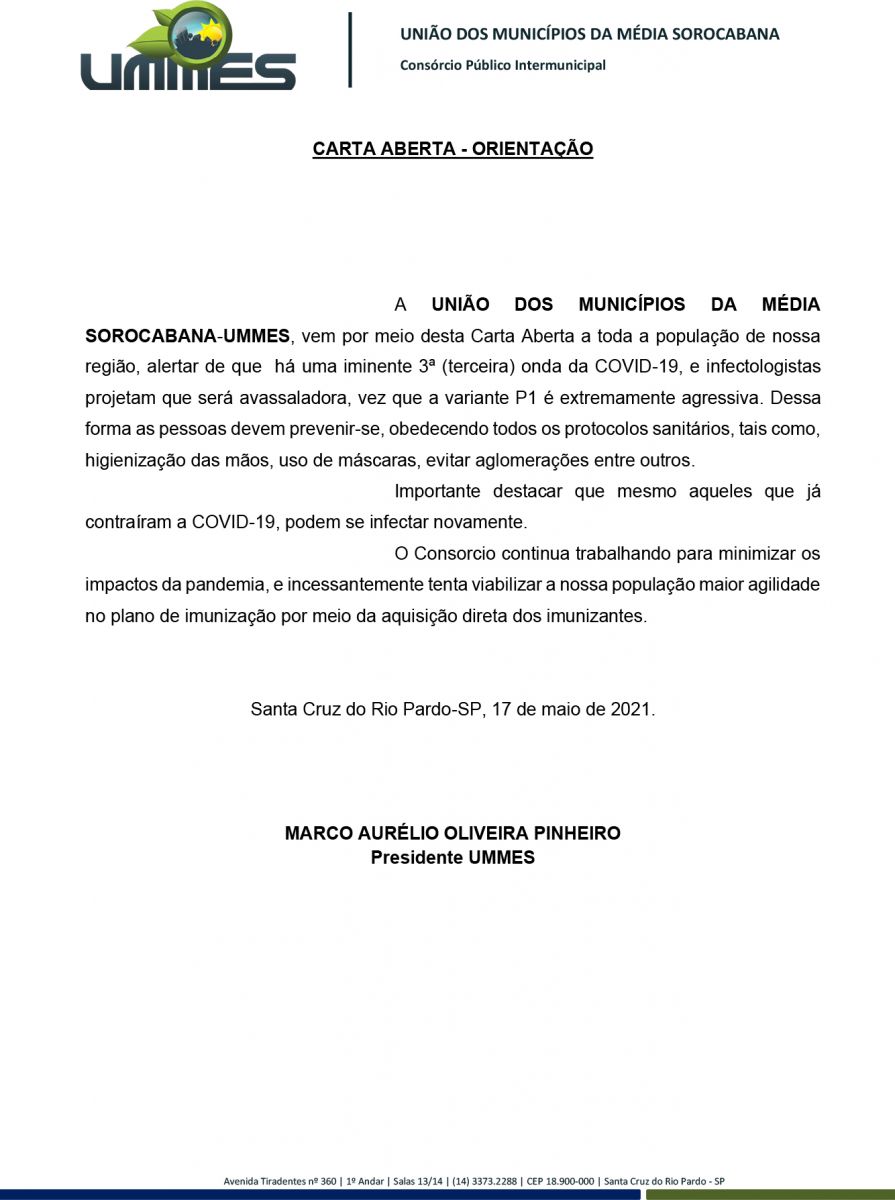 A UMMES (União Dos Municípios da Média Sorocabana) emitiu nesta segunda-feira, 17, uma carta aberta à população e fez um alerta sobre uma possível 3ª onda da Covid-19, apontada por infectologistas, que poderá causar ainda mais mortes, diante de novas variantes. O presidente da UMMES e prefeito de São Pedro do Turvo falou sobre a carta e da necessidade do apoio de todos diante da gravidade do momento que estamos passando. Confira o áudio acima e a carta abaixo: