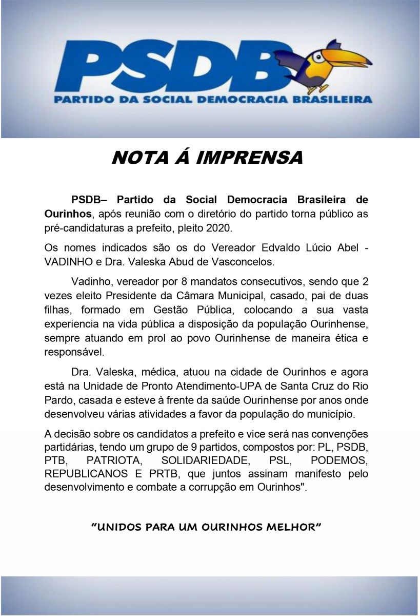 De acordo com a nota divulgada à imprensa, a decisão pelos nomes surgiu após reunião entre os membros do partido e agora os nomes de Vadinho e Drª Valeska se juntam a outros seis nomes já lançados por seus respectivos partidos que compõe o já conhecido grupo dos 9 partidos aliados - PL, PSDB, PTB, PATRIOTA, SOLIDARIEDADE, PSL, PODEMOS, REPUBLICANOS E PRTB, que juntos assinam manifesto pelo desenvolvimento e combate a corrupção em Ourinhos (em negrito partidos que têm os seus respectivos pré-candidatos).