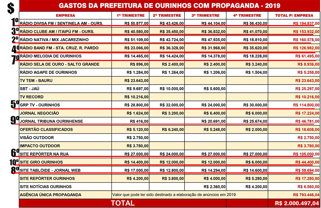Porém o vereador não citou outros gastos e recebimentos absurdos por veículos de comunicação completamente desconhecidos do grande público ourinhense como: site Tabloide (R$58.694,00) e Giro Ourinhos (R$44.400,00). O que justificaria estes altos valores?