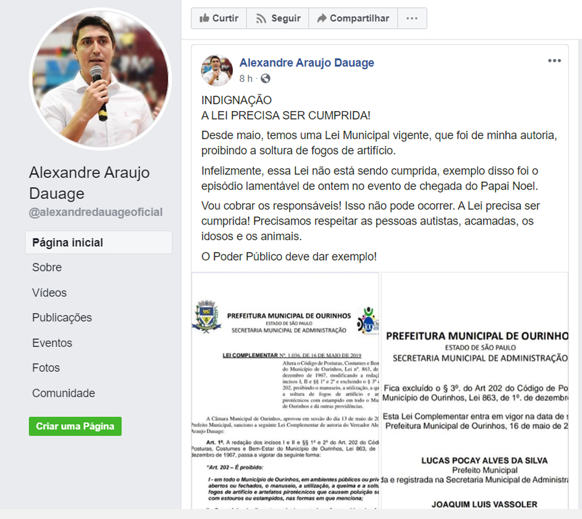 Após a grande repercussão da queima de fogos, realizada na noite da última sexta-feira, 13, em evento em comemoração ao aniversário de 101 da cidade de Ourinhos, no Parque de Exposições Olavo Ferreira de Sá (Fapi), o vereador de Ourinhos, Alexandre Zóio, que é autor da Lei Complementar nº. 1.036, que proíbe a prática na cidade, usou a sua rede social para lamentar e criticar a Prefeitura de Ourinhos que descumpriu a sua Lei. Alexandre Zóio disse que vai cobrar providências. Confira a postagem completa abaixo: