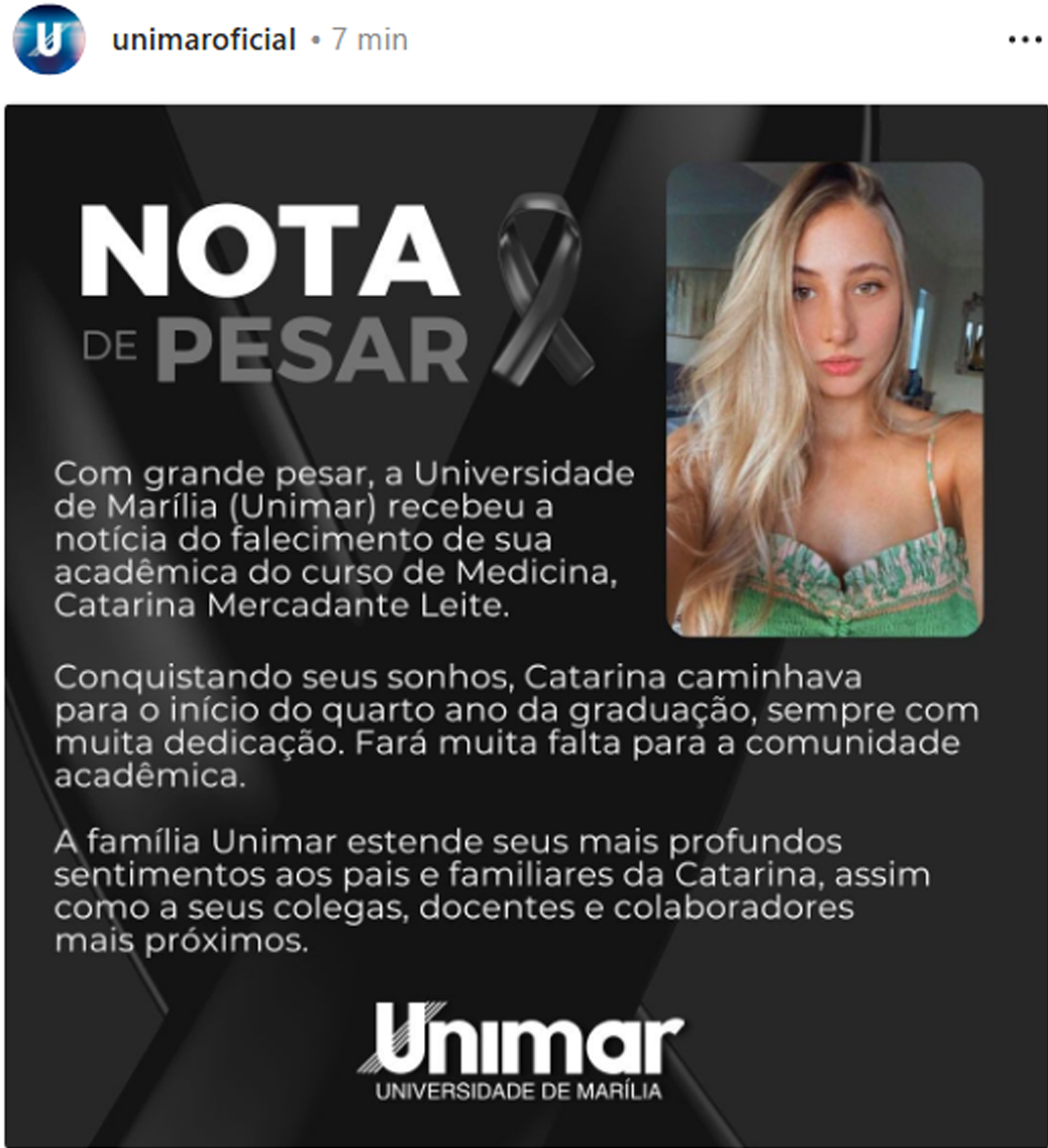Catarina estudava na UNIMAR (Universidade de Marília), que prestou uma homenagem: