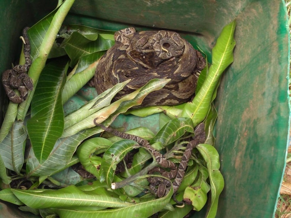 Jararaca e filhotes foram levados para o CEVAP da Unesp de Botucatu — Foto: Vigilância Ambiental em Saúde de Botucatu/Divulgação