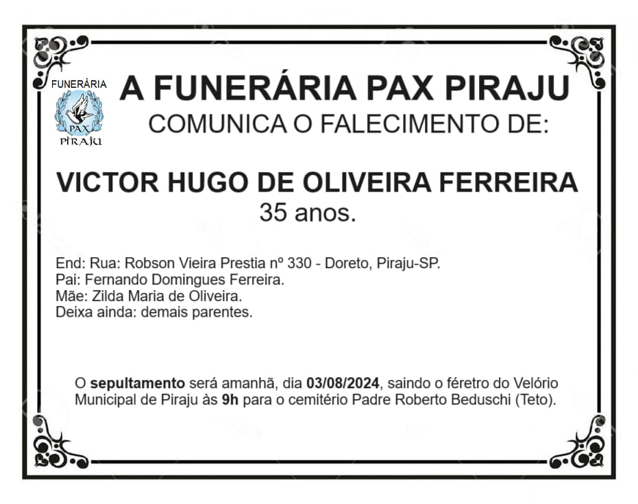 O corpo de Vitor Hugo Oliveira Ferreira, de 35 anos, será sepultado neste sábado, 3 de agosto, em Piraju (SP). Vitor Hugo foi encontrado sem vida às margens de uma cachoeira na cidade, na última sexta-feira, 2 de agosto. O jovem estava desaparecido desde a madrugada de quarta-feira, 31 de julho.