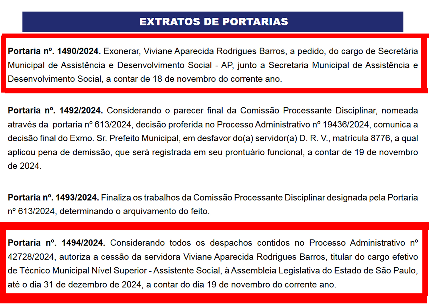 A secretária municipal de Assistência e Desenvolvimento Social de Ourinhos, Viviane Aparecida Rodrigues Barros, foi exonerada do cargo nesta terça-feira, 19, com efeito retroativo a 18 de novembro. A decisão foi oficializada por meio de publicação no Diário Oficial do Município, que também trouxe a Portaria nº 1494/2024, autorizando sua cessão à Assembleia Legislativa do Estado de São Paulo (ALESP).